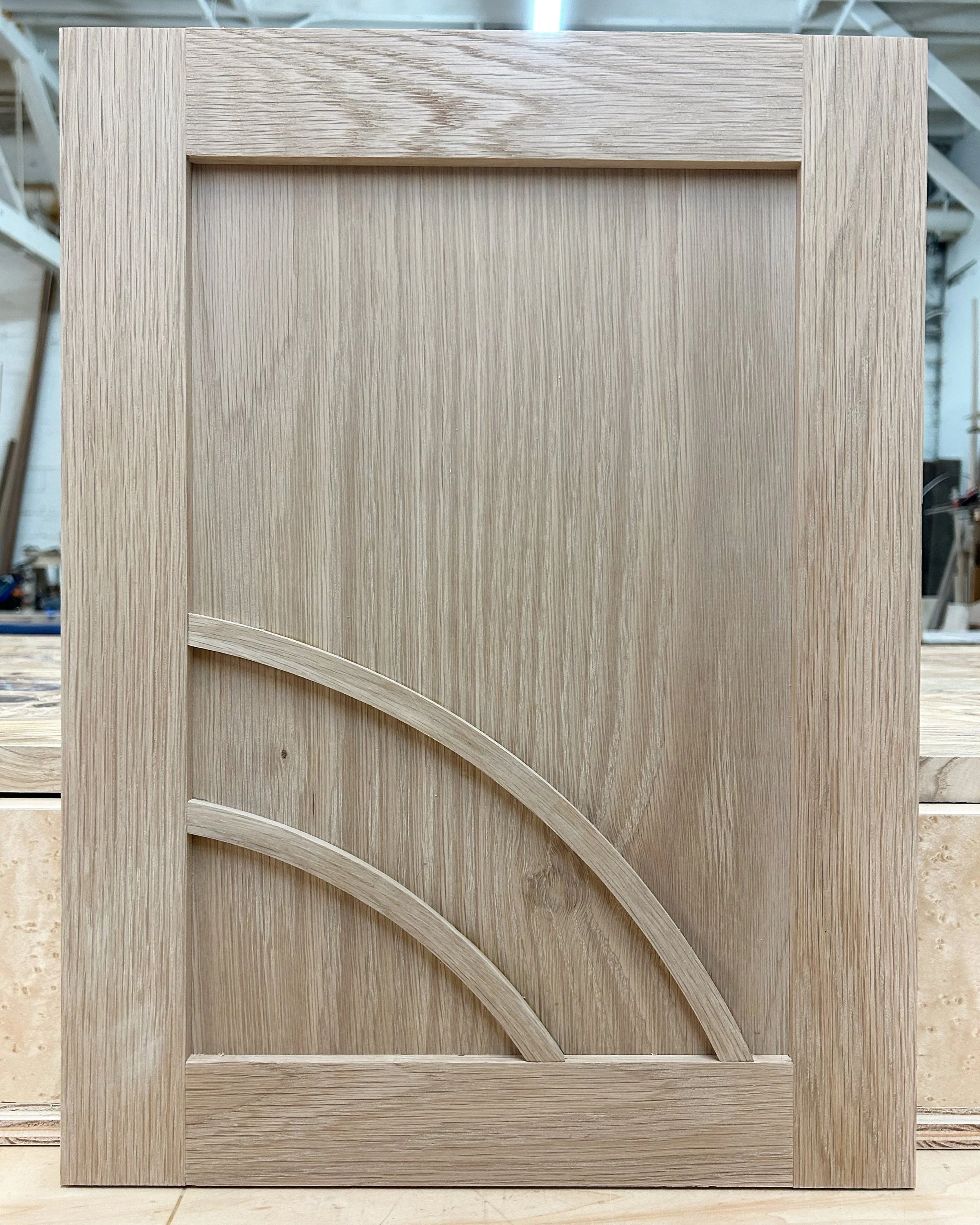 Right Angle Cabinetry : Inlay Design Option B : Shaker style upper doors, and slab front lower drawer faces featuring 1/2” reed inlays in both curved and straight lines